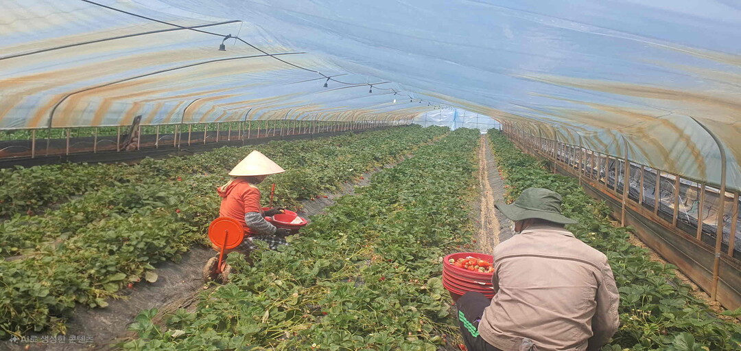 | ▲ 외국인 계절근로자가 딸기 수확 작업을 하고 있는 모습 [밀양시 제공] |