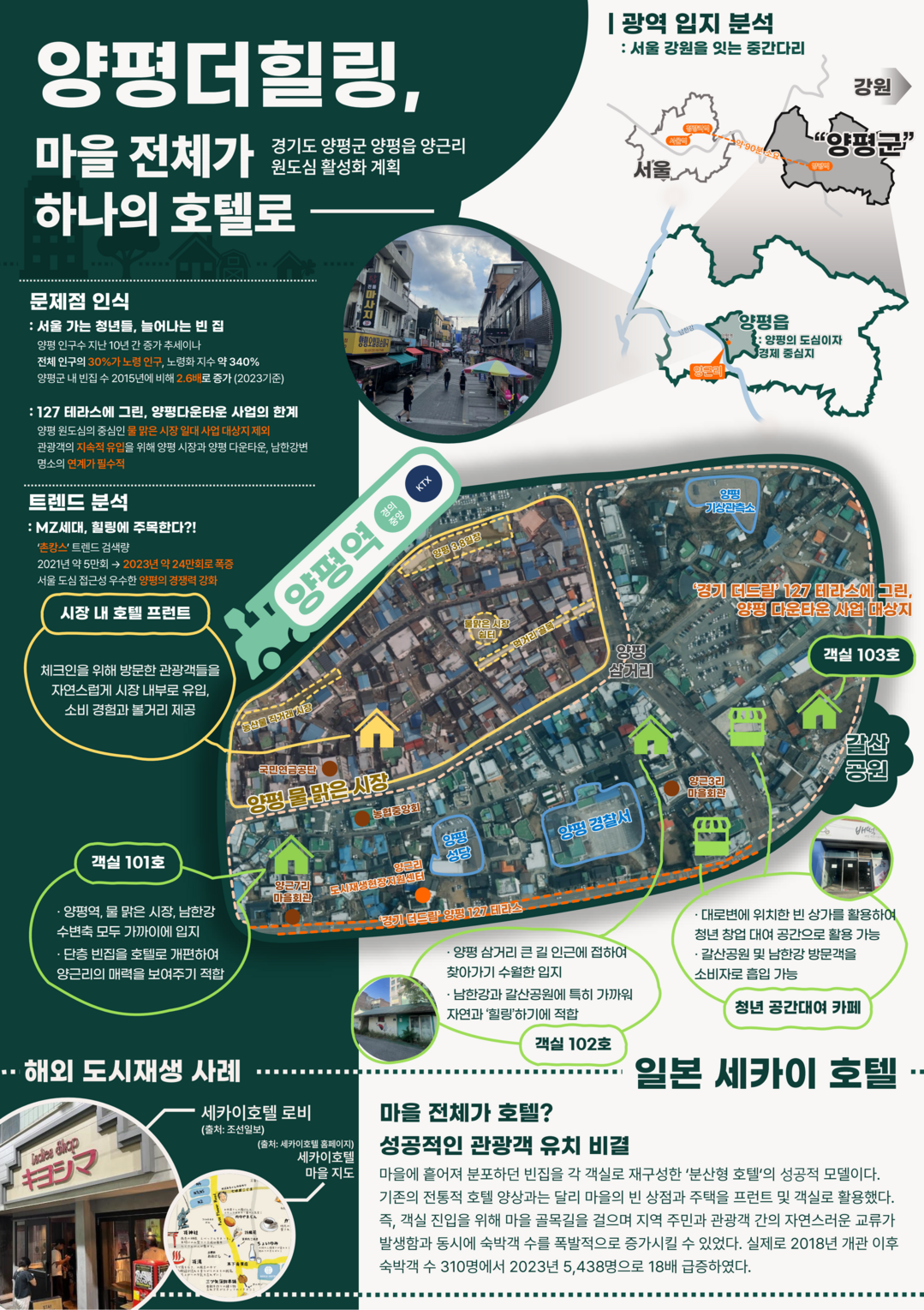 대상은 빈집을 리모델링해 마을 전체를 하나의 호텔로 브랜드화 하고, '경기 더드림 재생사업, 127테라스에 그린 양평다운타운'과 연계한 '양평더힐링, 마을전체가 하나의 호텔로'가 선정됐다.