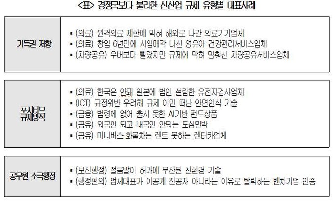 대한상의는 의료, 바이오, ICT, 금융 등 주요 신산업 분야에서 경쟁국보다 불리한 사례 분석을 통해 국내 진입규제 장벽이 높은 이유로 3대 덫을 지목했다. "한국은 기득권 저항, 포지티브 규제, 소극행정 3대 덫에 갇혔다"는 게 상의 주장이다.