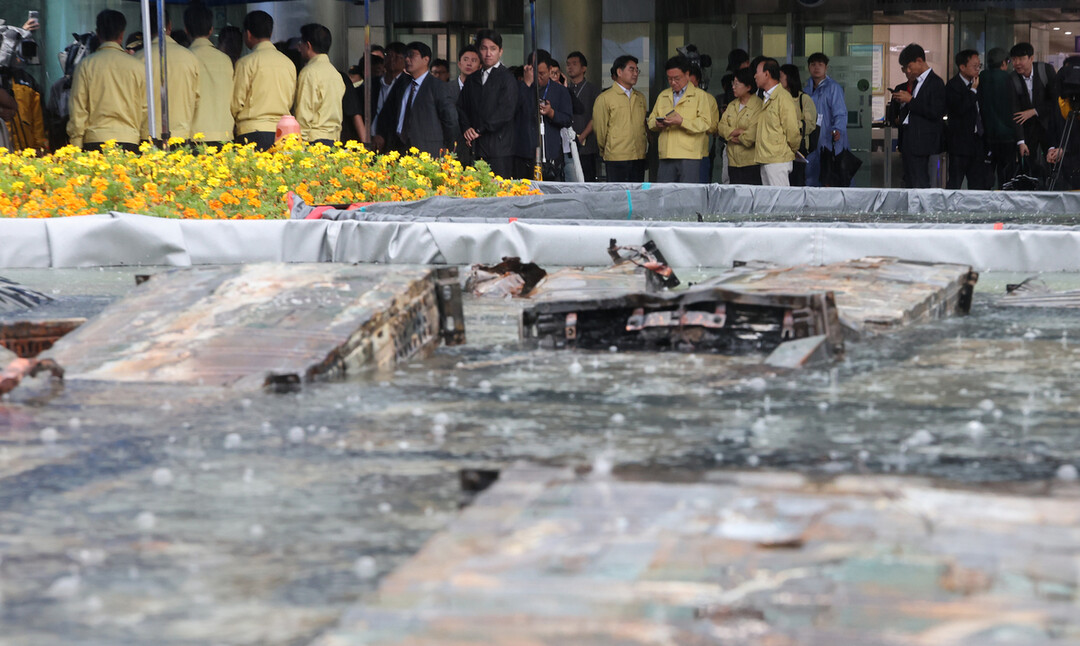 ▲ 국회 행정안전위 소속 의원들이 화재가 발생한 대전 유성구 국가정보자원관리원을 지난 28일 방문해 외부 침수조에 냉각작업 중인 리튬이온 배터리를 살펴보고 있다. [뉴시스] |