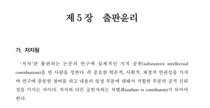 즉, 학술적 개념과 계획 혹은 자료 수집이나 분석 혹은 해석에 상당한 공헌을 하고, 논문을 작성하거나 중요한 내용을 수정하며, 출간된 원고를 최종적으로 승인하는 이 세 가지 조건 등을 모두 충족해야 논문 저자 자격이 주어진다.