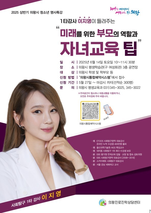 조지현 의왕시 평생교육원장은 "청소년 학업 생활과 일상 모두에 도움이 되는 수준 높은 명사 특강을 준비했다"며 "청소년들과 학부모들의 많은 관심을 부탁드리며, 하반기에도 대입 설명회 등 청소년들에게 실질적인 도움이 되는 교육 행사를 마련하겠다"고 말했다.