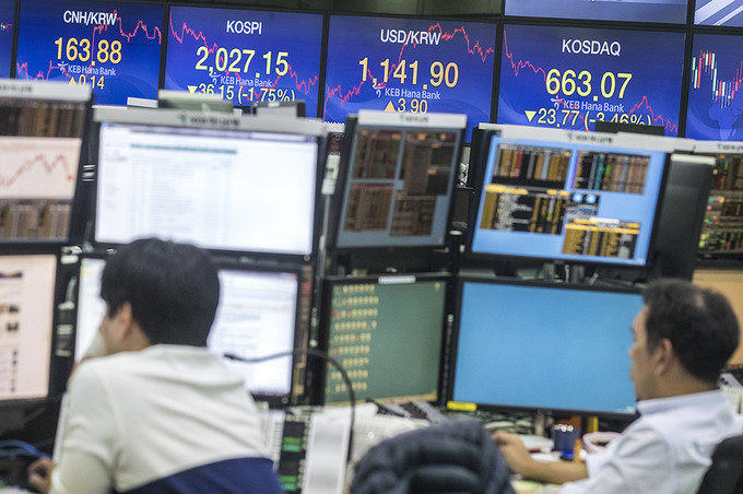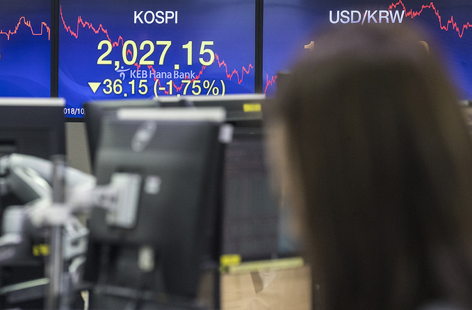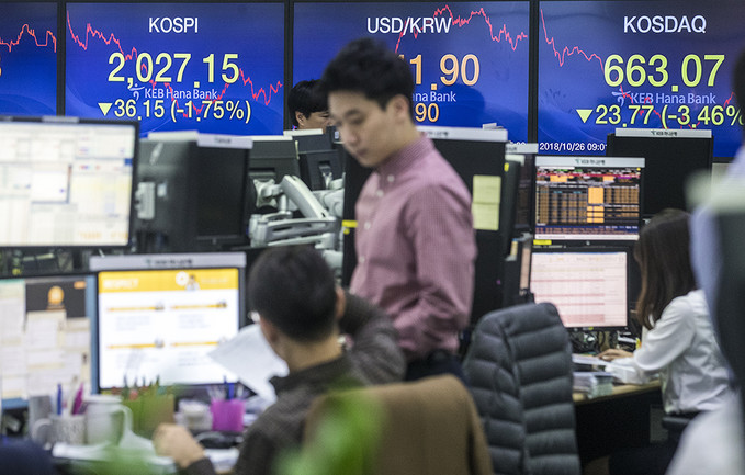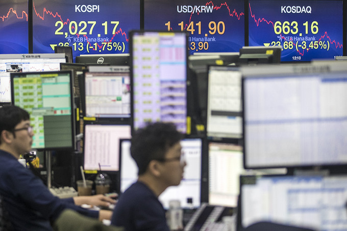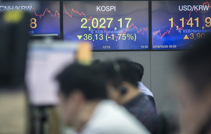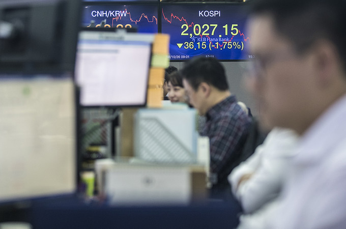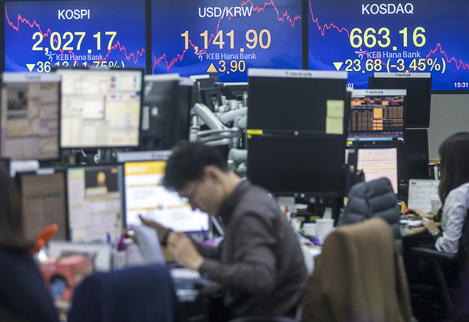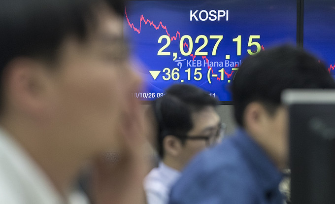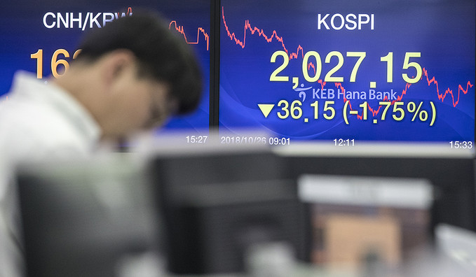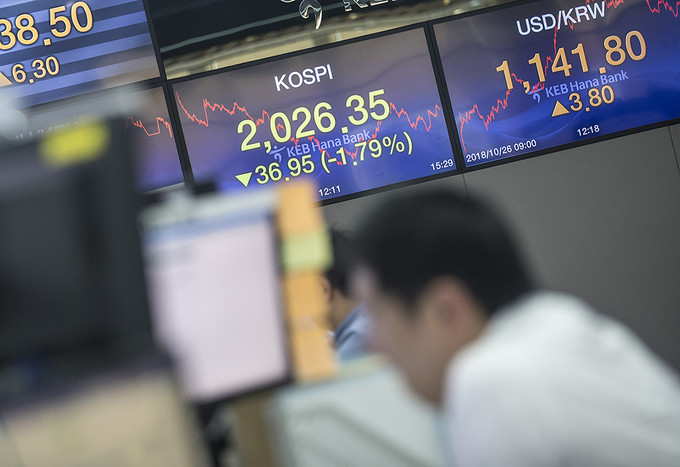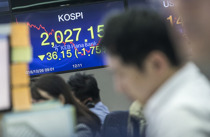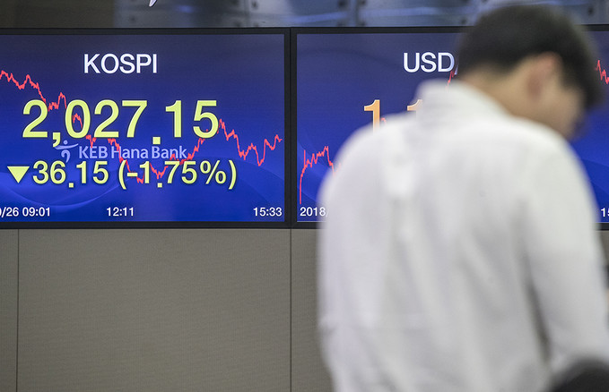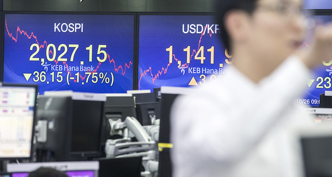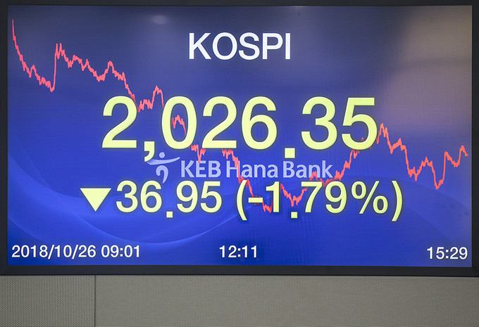 코스피가 나흘 연속 연중 최저점을 경신한 26일 서울 중구 KEB하나은행 딜링룸 전광판에 코스피지수가 전일 대비 36.15p(1.75%) 내린 2,027.15를 나타내고 있다. 장중 한때는 2010선마저 무너지면서 심리적 저지선인 2000선 조차 흔들렸다.
