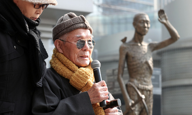 ▲ 지난 3월 1일 오전 서울 용산역 강제징용노동자상 앞에서 열린 3.1운동 100주년 강제징용노동자상 합동 참배 행사 현장에서 1941년 신일철주금 강제징용 피해자인 이춘식 할아버지가 마이크를 들고 발언하고 있다. [뉴시스]