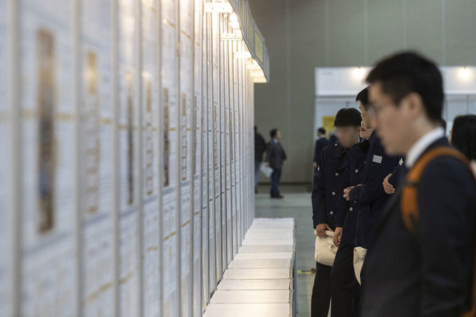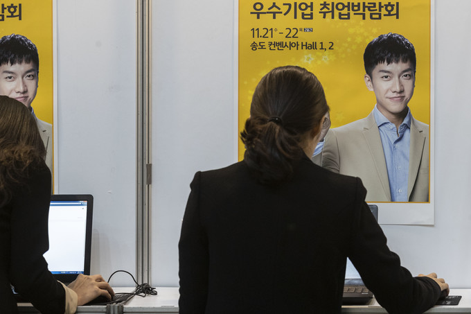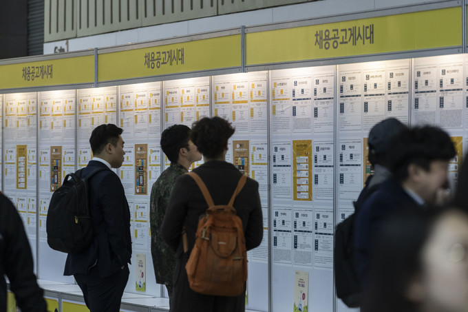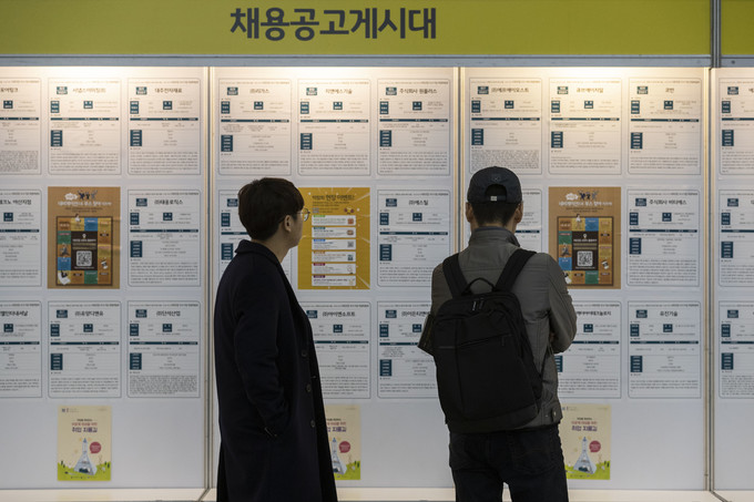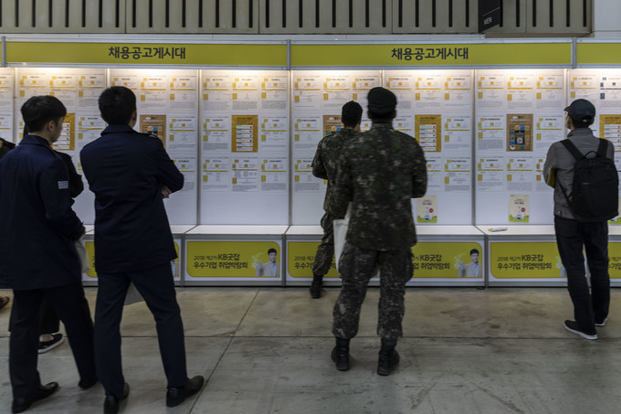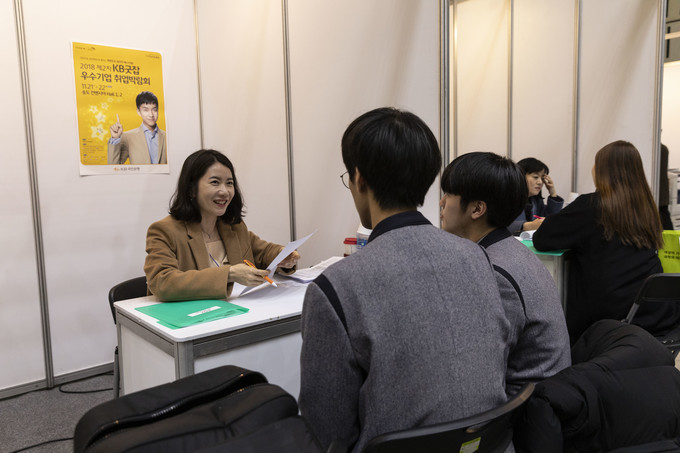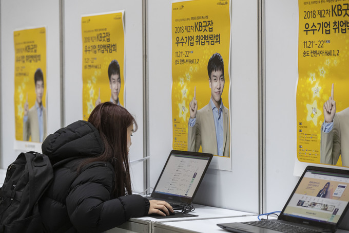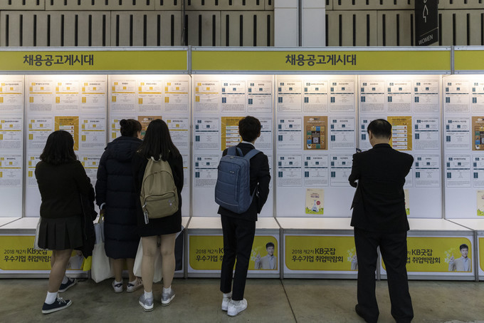 '2018 제2차 KB 우수기업 취업박람회'가 21일 오후 인천시 연수구 송도컨벤시아에서 열린 가운데 구직자들이 채용공고 게시대를 보고 있다.