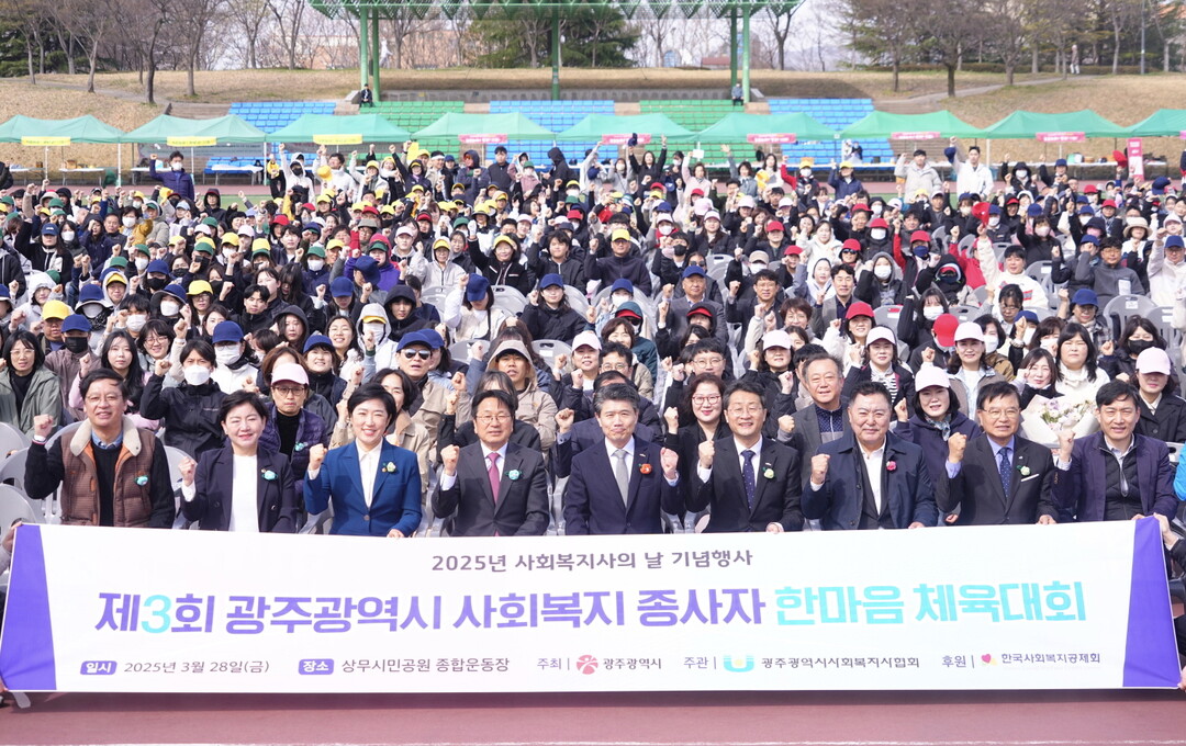 ▲ 강기정 광주광역시장이 28일 오전 서구 상무시민공원 종합운동에서 열린 '제3회 광주시 사회복지 종사자 한마음체육대회'에 참석해 행사에 앞서 기념촬영을 하고 있다. [광주광역시 제공]