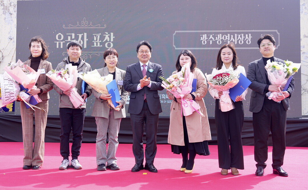 ▲ 강기정 광주광역시장이 28일 오전 서구 상무시민공원 종합운동에서 열린 '제3회 광주시 사회복지 종사자 한마음체육대회'에 참석해 유공자 표창을 한 뒤 기념촬영을 하고 있다. [광주광역시 제공]