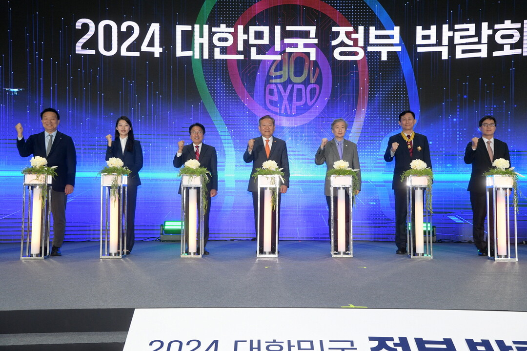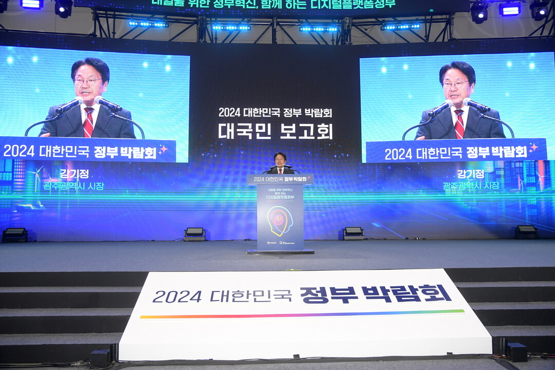 | ▲ 강기정 광주광역시장이 15일 오전 김대중컨벤션센터에서 열린 '2024 대한민국 정부박람회 대국민 보고회'에 참석, 환영사를 한 후 참석자들과 함께 세리머니를 하고 있다. [광주광역시 제공] |