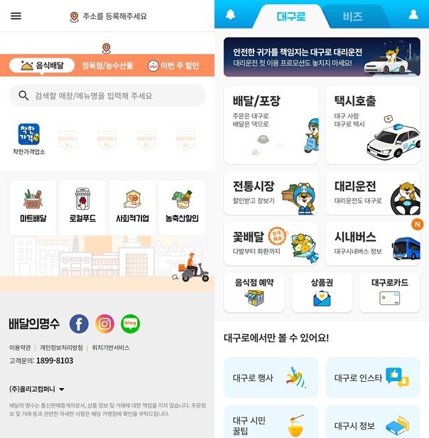 | ▲공공배달앱 '배달의 명수'와 '대구로' 앱 화면 캡쳐.[유태영 기자] |