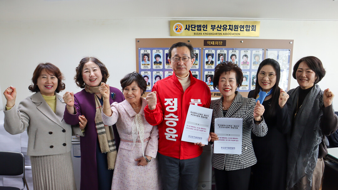 이날 부산유치원연합회를 찾아간 정승윤 후보는 연합회 임원들과 정책 간담회를 갖고 "유치원에서 문해력의 기초를 닦아야 하기 때문에 무상교육을 적극 추진하겠다"고 약속했다.