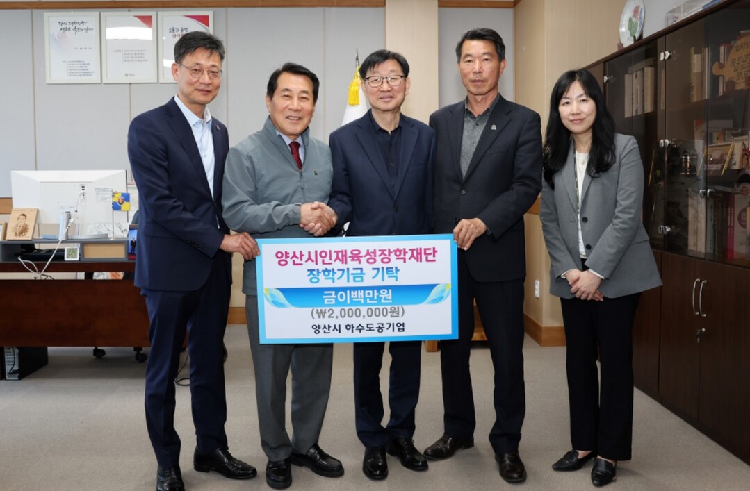 양산시하수도공기업은 7일 양산시인재육성장학재단에 장학기금 200만 원을 기탁했다. 양산시하수도공기업은 하수도 계획·시설 정비, 요금체계 설정 등을 처리하는 양산시 산하 공기업이다.