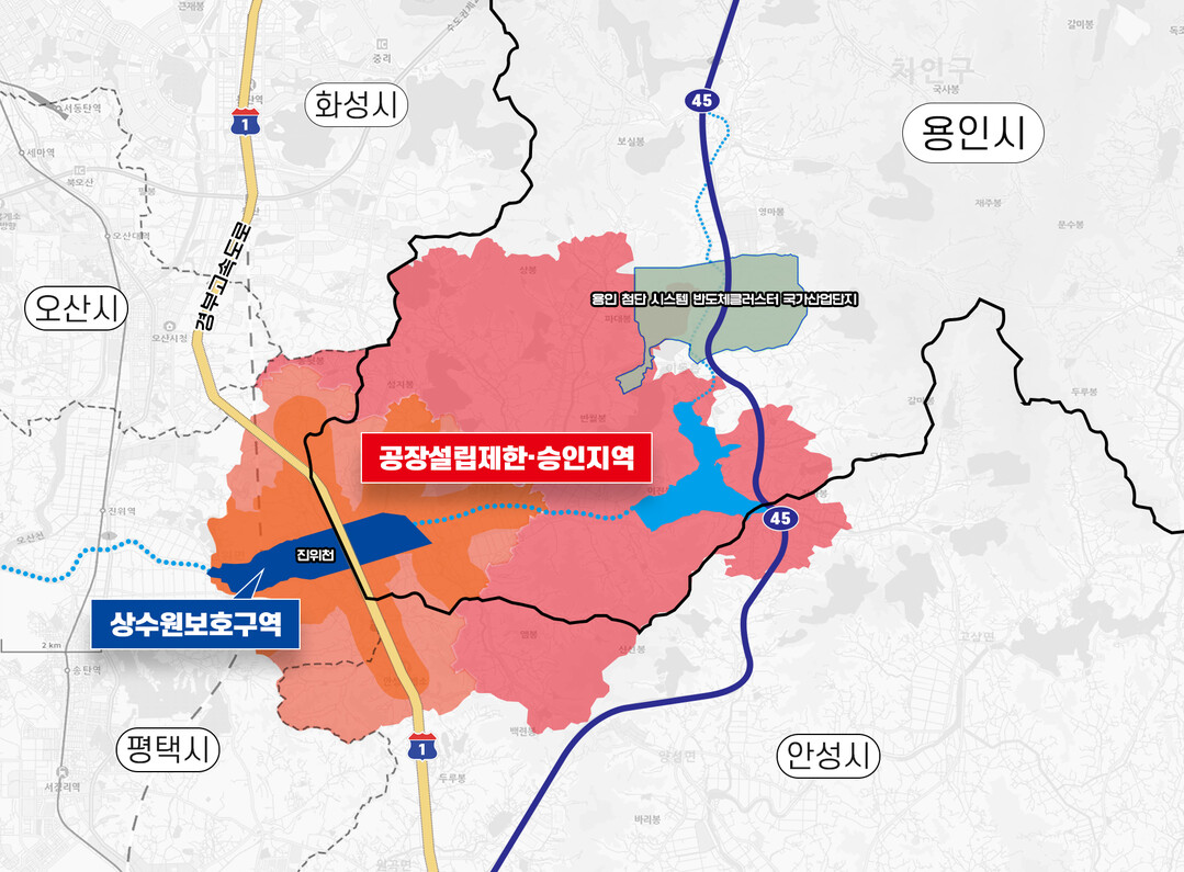 삼성전자가 반도체 생산라인(팹·Fab) 6기를 건설하고 반도체 소재ㆍ부품ㆍ장비 기업과 설계기업 150여개가 들어서게 될 이곳 국가산업단지 일부 지역이 '송탄 상수원보호구역'에 포함된 것을 계기로 보호구역 해제를 위한 용인특례시와 평택시, 경기도, 국토교통부, 환경부 등 관계기관이 협의를 시작했다.
