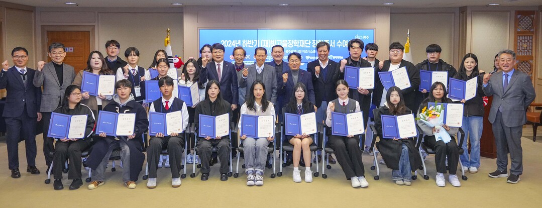 ▲ 강기정 광주광역시장이 20일 오전 시청 비즈니스룸에서 열린 (재)빛고을장학금 증서 수여식에 참석해 학생들에게 장학증서를 수여한 뒤 기념촬영을 하고 있다. [광주광역시 제공]