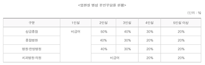 우선 일반병원·한방병원의 2·3인실은 이미 건강보험이 적용되고 있는 종합병원의 2·3인실과 동일한 혜택을 본다. 입원실 병상 본인부담률은 2인실 40%, 3인실 30%다. 4인실 이상 다인실 20%다.