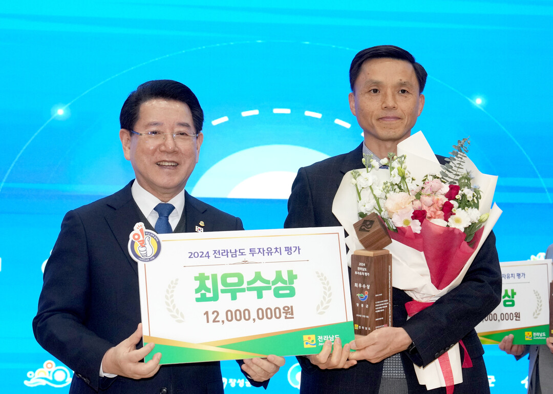| ▲ 13일 유앙선(오른쪽) 장흥군 경제산업과장이 전남도청 동부청사 이순신강당에서 열린 '2024 전라남도 투자유치 평가'에서 김영록 전남지사로부터 투자유치 대상 지자체로서 표창을 수여받고 있다. [전남도 제공] |