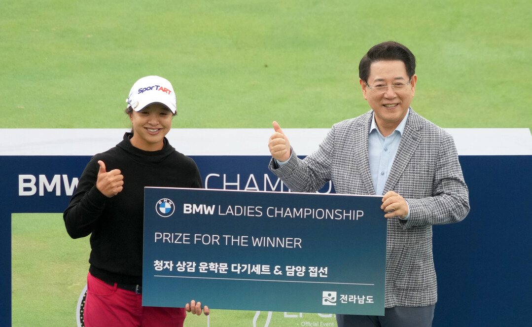 | ▲ 'LPGA BMW 레이디스 챔피언십 대회' 시상식이 19일 해남군 파인비치 CC에서 열린 가운데 김영록 전라남도지사가 우승자 김세영에게 기념품을 전달하고 촬영을 하고 있다. [전남도 제공] |