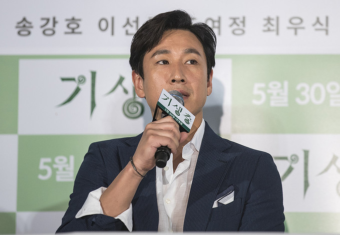 칸 국제영화제에서 황금종려상을 수상한 영화 '기생충'의 배우 이선균이 28일 오후 서울 용산구 용산CGV에서 열린 언론배급시사회에서 질문에 답하고 있다.