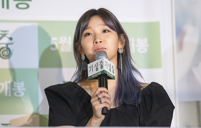 칸 국제영화제에서 황금종려상을 수상한 영화 '기생충'의 배우 박소담이 28일 오후 서울 용산구 용산CGV에서 열린 언론배급시사회에서 질문에 답하고 있다.