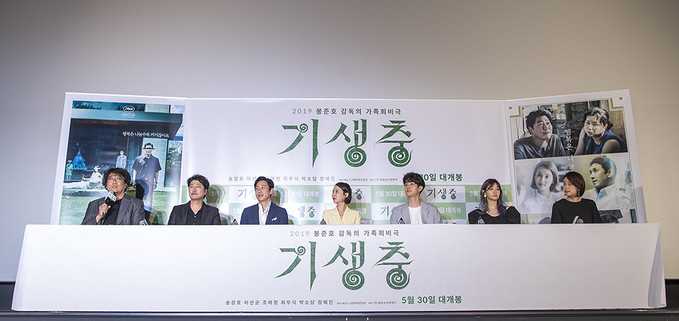 칸 국제영화제에서 황금종려상을 수상한 영화 '기생충'의 봉준호 감독 및 배우들이 28일 오후 서울 용산구 용산CGV에서 열린 언론배급시사회에서 질문에 답하고 있다.