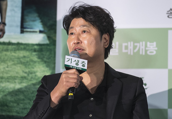 칸 국제영화제에서 황금종려상을 수상한 영화 '기생충'의 배우 송강호가 28일 오후 서울 용산구 용산CGV에서 열린 언론배급시사회에서 질문에 답하고 있다.