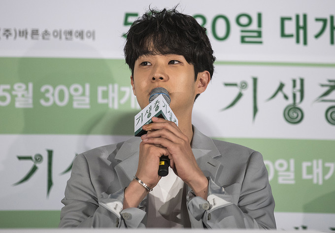 칸 국제영화제에서 황금종려상을 수상한 영화 '기생충'의 배우 최우식이 28일 오후 서울 용산구 용산CGV에서 열린 언론배급시사회에서 질문에 답하고 있다.