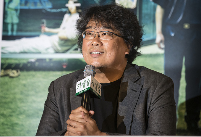 칸 국제영화제에서 황금종려상을 수상한 영화 '기생충'의 봉준호 감독이 28일 오후 서울 용산구 용산CGV에서 열린 언론배급시사회에서 질문에 답하고 있다.