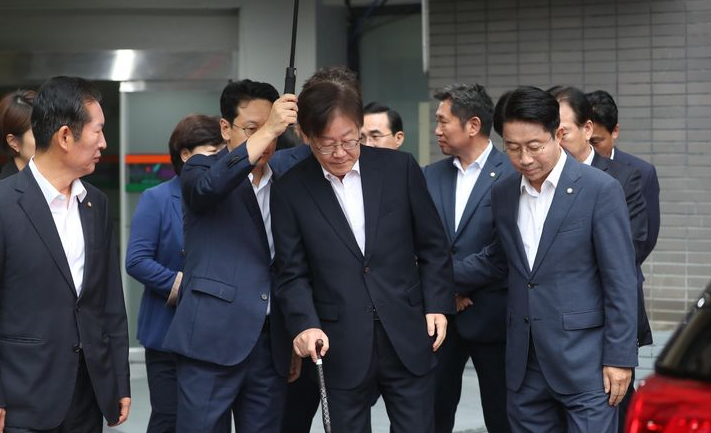앞서 이 대표는 이날 오전 10시 3분쯤 법원 앞에 도착해 홀로 차에서 내려 수행원에게서 우산을 건네받았다. 이어 왼손으로 우산을 든 채 오른손으로 지팡이를 짚고 법원으로 걸어갔다.