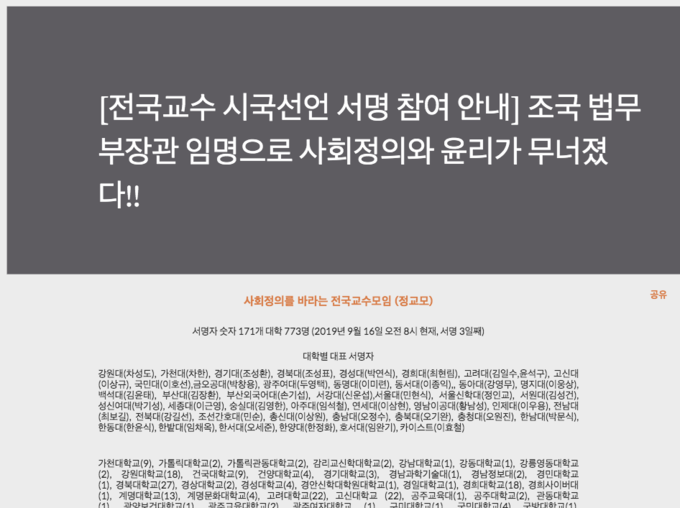 정교모 측은 서명 3일째인 16일 오전 8시 기준 171개 대학에서 773명이 서명에 동참했다고 공식 블로그를 통해 알렸다.