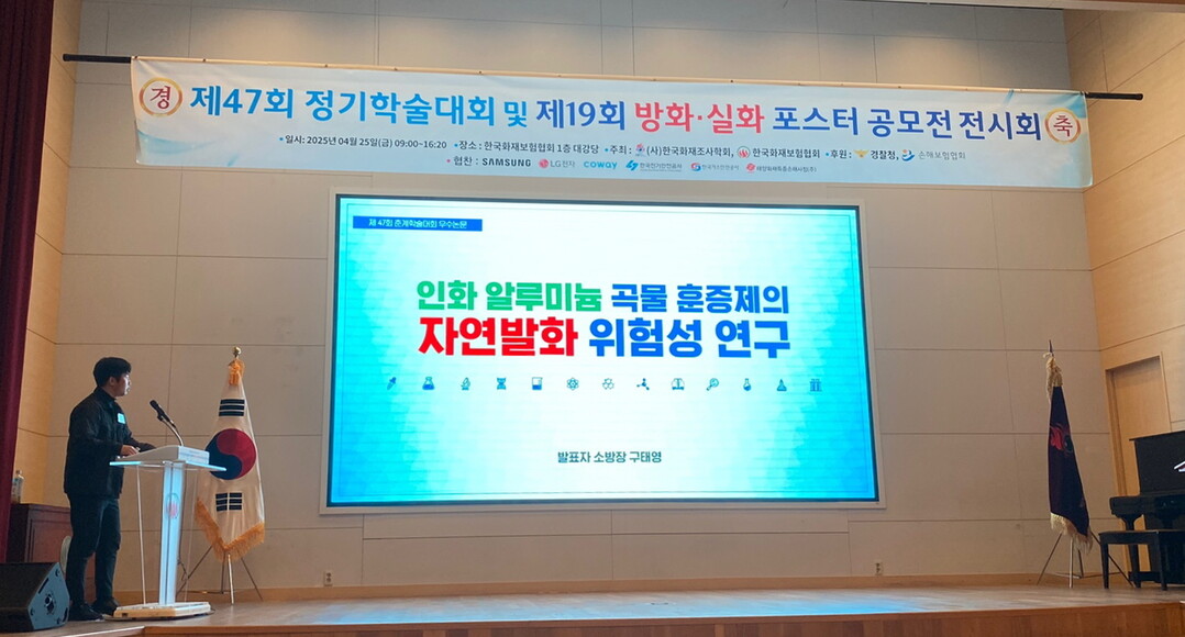 밀양소방서는 '2025년도 제47회 춘계학술대회'에 출품한 '인화알루미늄 곡물훈증제 자연발화 위험성 연구' 논문이 우수논문으로 선정돼 '한국전기기술사 회장상'을 수상했다고 밝혔다.