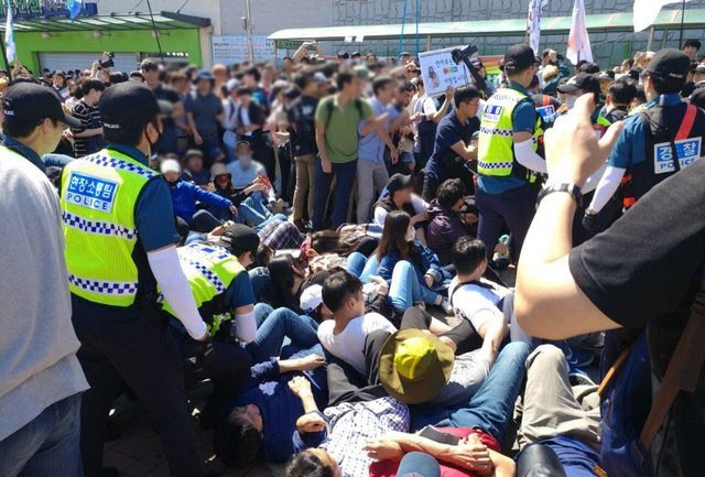 반대단체는 이 과정에서 축제 현장에 배치된 경찰과도 충돌을 빚었다. 이러한 대치 상황으로 인해 축제 주최 측은 계획했던 일부 행사를 취소했고, 5시께 진행하기로 했던 거리행진을 9시께 가까스로 진행했다.