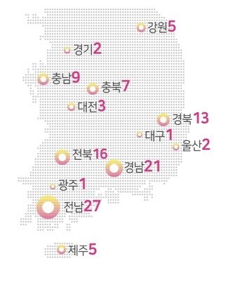 전남에 이어 경남 21개, 전북 16개, 경북 13개로 집계됐다. 이들 지역은 주로 우리나라 남쪽지역에 위치, 풍요로운 곡창지대가 있는 곳이다.