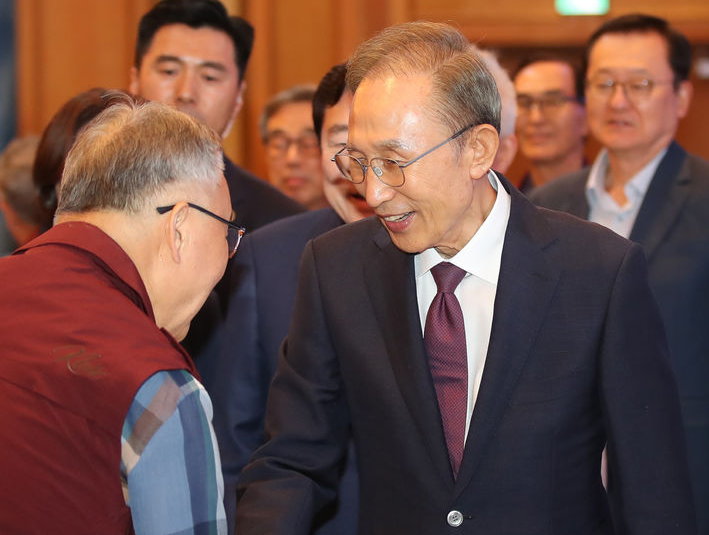 | ▲ 이명박 전 대통령이 지난 12일 서귀포시 롯데호텔 제주에서 열린 '2023 중소기업 리더스포럼' 개막식에서 참석자들과 인사를 나누고 있다. [뉴시스] |