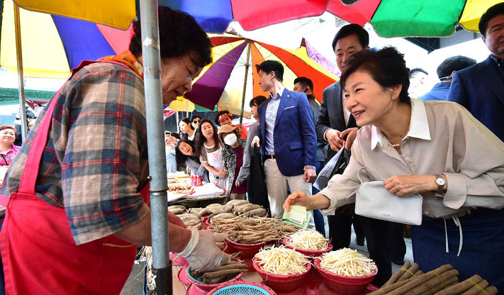 박 전 대통령이 시장에 나타나자 상인들은 박수치거나 환호하며 맞았다. 박 전 대통령은 어묵, 연근, 고구마 줄기 등을 직접 현금을 주고 구매했다.
