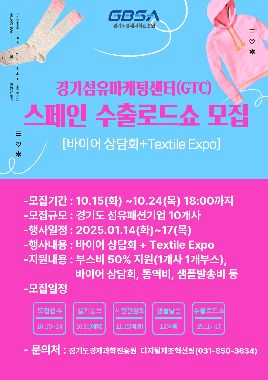 모집대상은 경기도 내 섬유패션 기업 10개 사로 부스비 50%지원, 통역비, 샘플 발송비 등을 지원할 예정이다. 모집기간은 이달 24일 오후 6시까지며, 이지비즈 홈페이지를 통해 신청하면 된다.