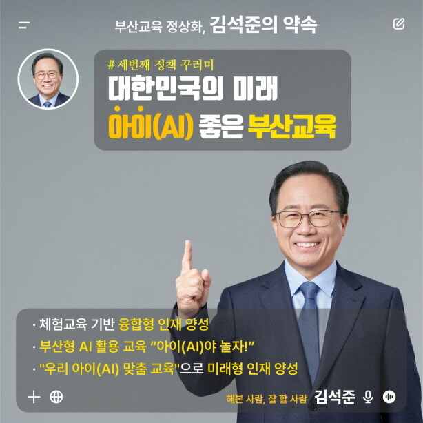 김석준 부산시교육감 예비후보는 10일 세 번째 정책 꾸러미 '대한민국의 미래-아이(AI) 좋은 부산교육'을 발표했다. 부산을 명실상부한 'AI교육 중심'으로 만들겠다는 구상이다.
