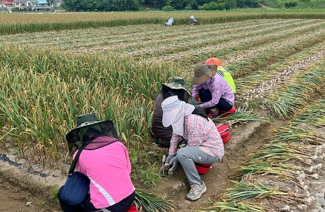 | ▲ 도천면 직원과 군청 행복나눔과 직원들이 마늘 수확 작업을 도우며 일손을 보태고 있다. [창녕군 제공] |