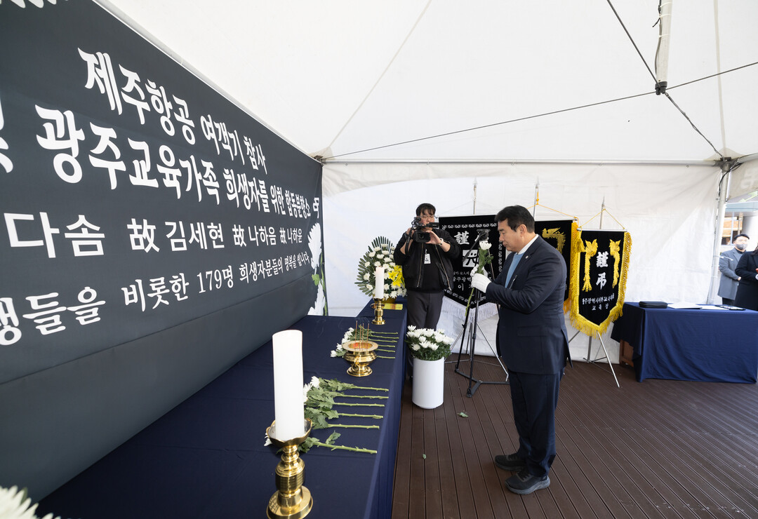 ▲ 이정선 광주시교육감이 지난해 12월31일 이음광장에 마련된 '제주항공 여객기 참사 희생자 합동분향소'에서 헌화를 하고 있다. [광주시교육청 제공]