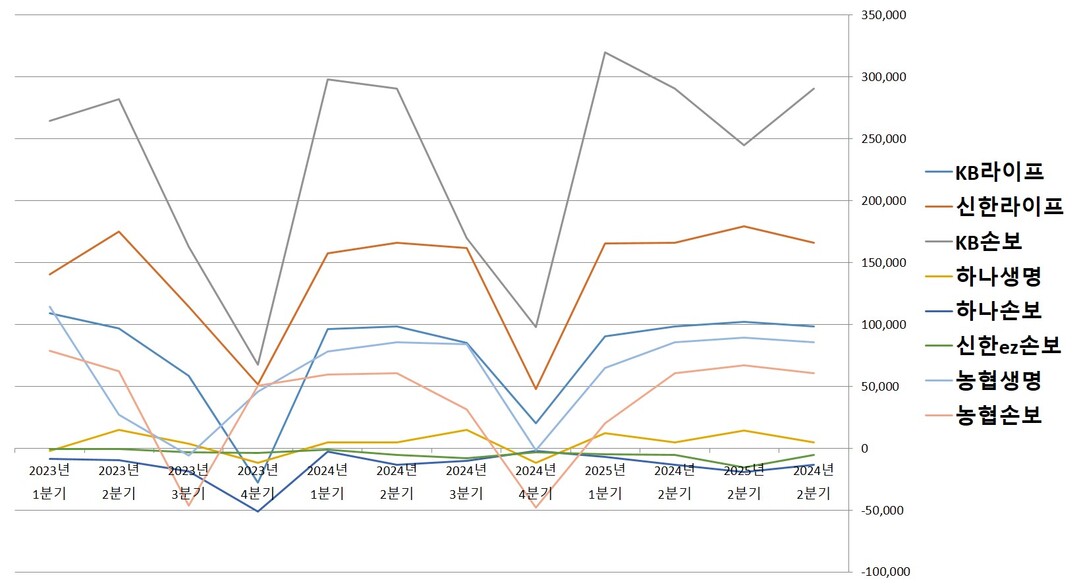 | ▲ 2023년 1분기~2025년 2분기 금융지주 계열 보험사 분기별 실적. [각 사 공시] |