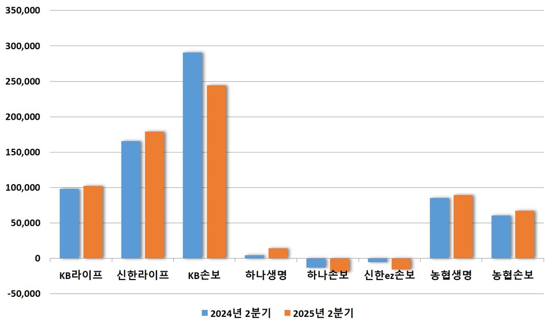 | ▲ 금융지주 계열 보험사들의 2024년 2분기 및 2025년 2분기 당기순이익 비교(단위: 백만 원). [각사 공시] |