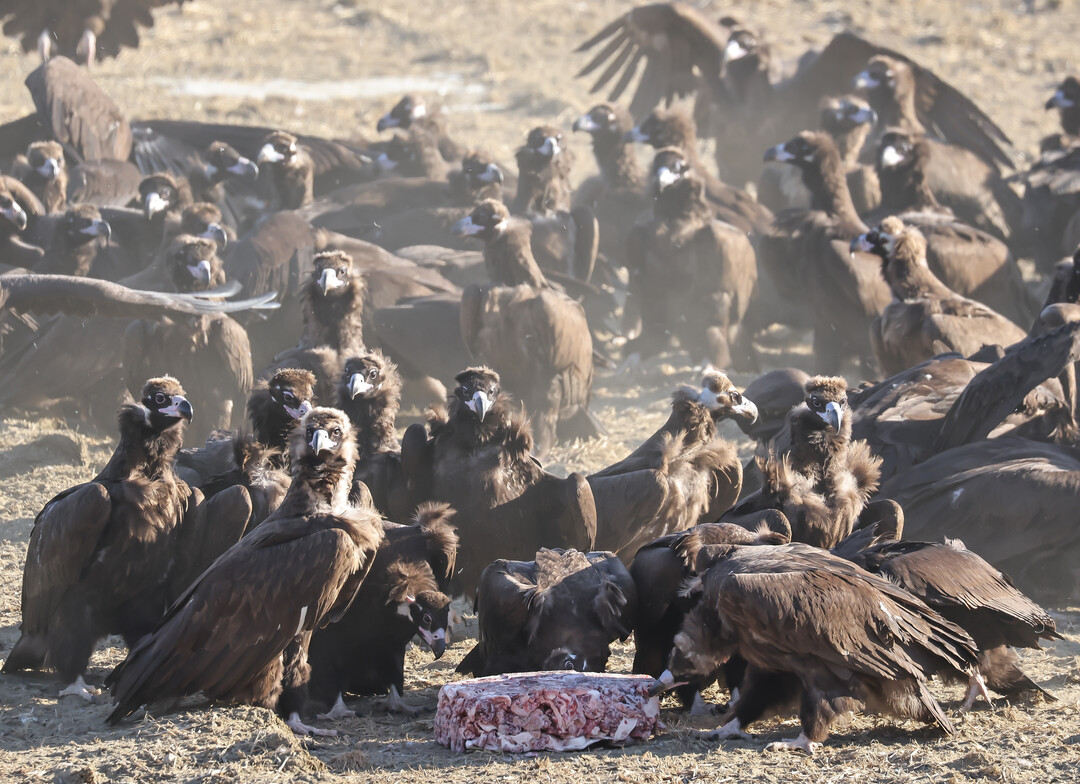 독수리들과 함께 먹이를 먹는 새 가운데는 흰꼬리수리도 있다. 흰꼬리수리는 직접 사냥을 하지만, 독수리는 사냥 능력이 없어 이렇게 정기적인 먹이 공급이 필요하다.