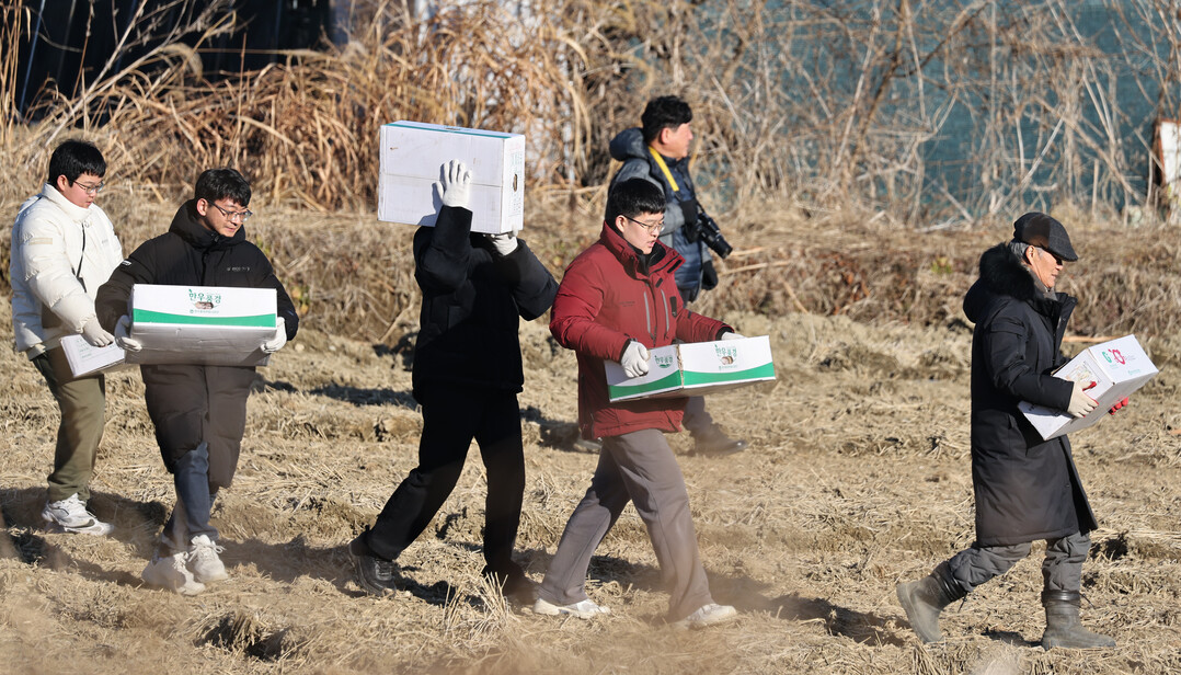 | ▲ 임진강 생태보존회 회원들과 탐조객들이 독수리에게 줄 먹이를 들고 들판으로 가고 있다. [이상훈 선임기자] |