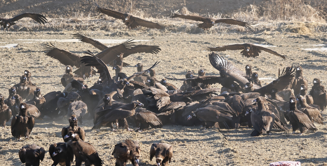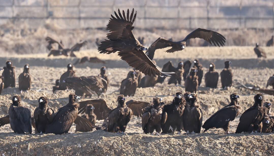 8일 한파주의보가 내려진 파주시 장산리 들판에 검은색 독수리들이 가득 모여 있다. 저 멀리 몽골에서 약 10일을 날아와 이곳에서 겨울을 나고, 3월이면 다시 몽골로 돌아가는 독수리들이다.