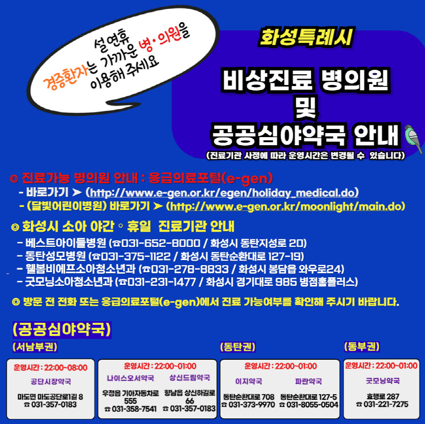 또 시민들이 편리하게 의료기관을 찾을 수 있도록 연휴기간 운영하는 병·의원과 약국 정보를 화성시 보건소 홈페이지와 SNS, 문자메시지 안내를 통해 제공하게 된다.