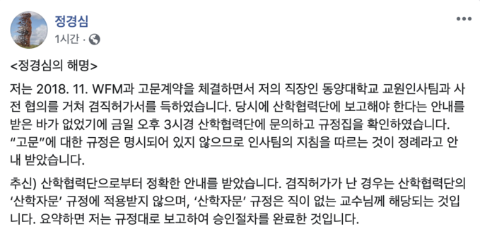 정 교수는 "당시 산학협력단에 보고해야 한다는 안내를 받은 바가 없었기에 이날 오후 3시께 산학협력단에 문의하고 규정집을 확인했다"며 "'고문'에 대한 규정은 명시돼 있지 않으므로 인사팀의 지침을 따르는 것이 정례라고 안내받았다"고 해명했다.