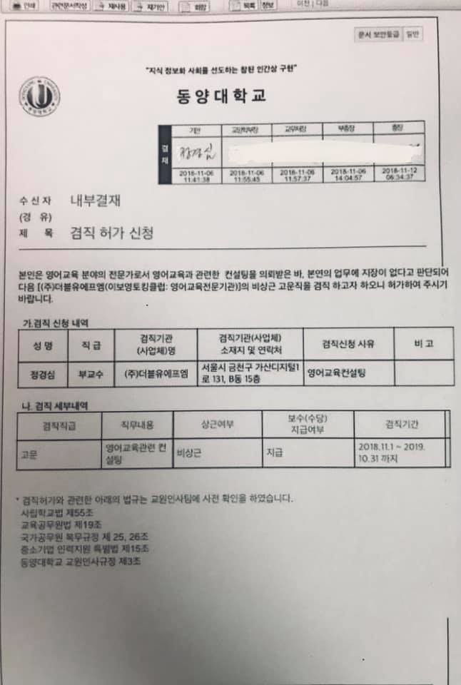 그러면서 동양대 총장에게 결재받은 겸직허가 신청서도 첨부했다. 해당 문건에는 정 교수가 2018년 11월 1일부터 올해 10월 31일까지 영어교육컨설팅을 위한 WFM의 비상근 고문으로 수당을 받으며 겸직하겠다는 내용이 담겼다.