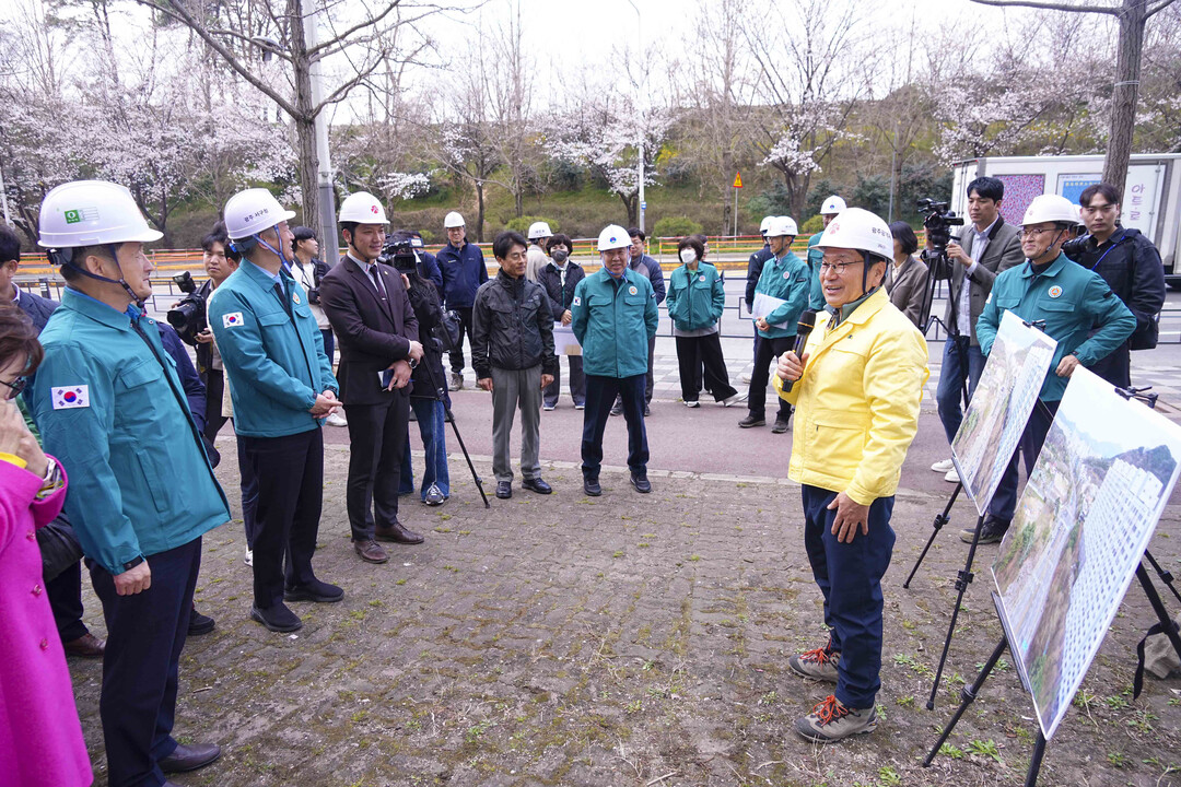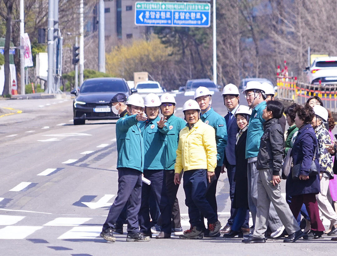 | ▲ 강기정 광주광역시장이 31일 오후 서구 풍암저수지사거리에서 김이강 서구청장, 시의원, 주민 등과 함께 광주도시철도 2호선 1단계 사업 교통개방구간에 대한 안전점검을 실시하고 있다. [광주광역시 제공] |