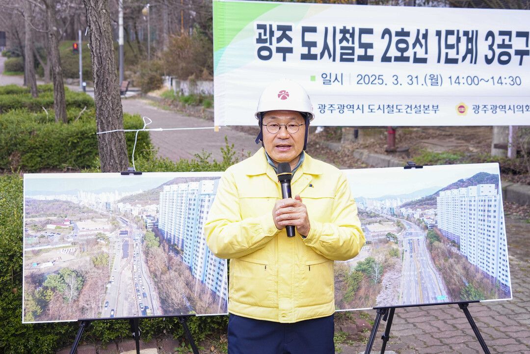 | ▲ 강기정 광주광역시장이 31일 오후 서구 풍암저수지사거리에서 광주도시철도 2호선 1단계 사업 교통개방구간에 대한 안전점검 실시에 앞서 인사말을 하고 있다. [광주광역시 제공] |
