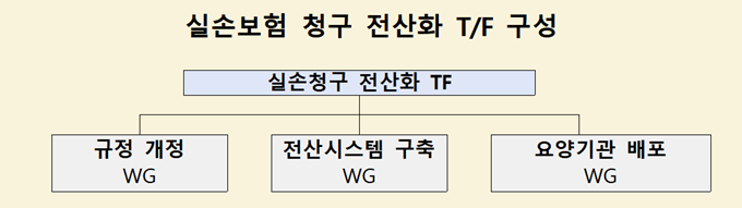 '실손보험 청구 전산화 TF' 산하에는 3개의 기능별 워킹그룹을 구성해 실무사항들을 추진하고, 주요 논의·결정 필요사항을 TF에 보고하게 된다. TF 회의는 매월 1회 정기적으로 개최하기로 했으며, 필요시 수시로 회의 등을 진행하기로 했다.