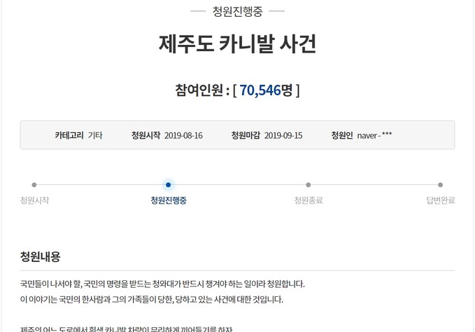 해당글은 16일 오후 5시 40분 기준 청원 동의자 7만 명을 넘었다. 동의자가 30일 내에 20만 명을 넘으면 청와대 관계자가 직접 청원글에 대한 답변을 한다.