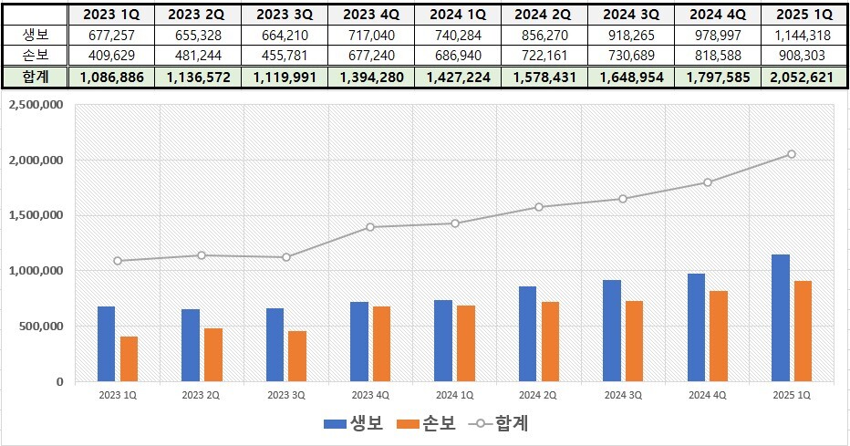 ▲ IFRS17 도입 이후 보험업계(생명보험 22개사 및 손해보험 19개사) 가중부실자산 규모 분기별 추이. [각 보험사 경영공시]